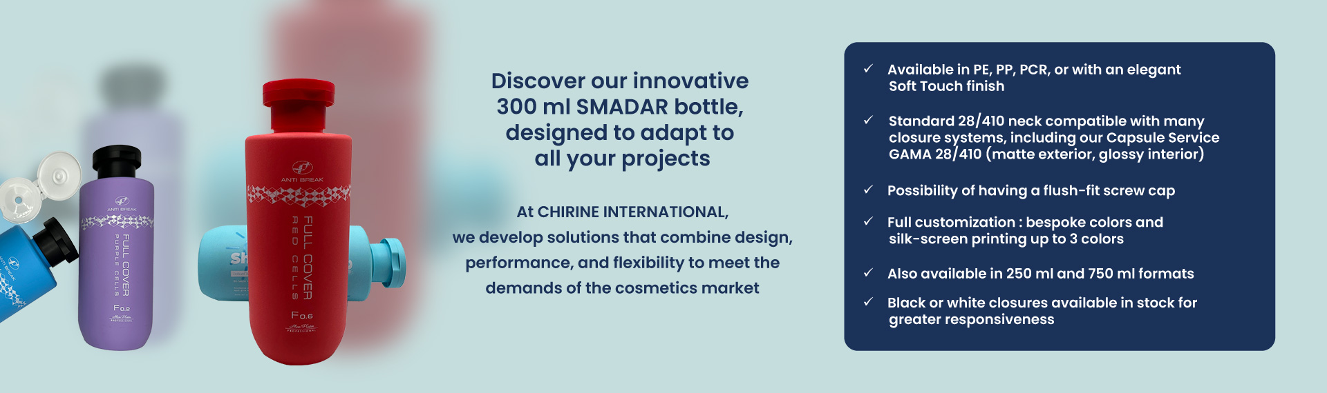 Spécialiste du packaging cosmétique, Chirine International propose une offre variée de tubes, pots et flacons personnalisables et adaptés à vos développements beauté pour faire la différence.